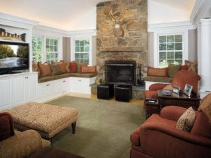 Renovation of the family room included removing outdated wood paneling; designing built-in seating, a television cabinet, and bookcases; and adding cornice trim around the perimeter