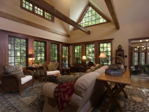 The homeowner wanted a vaulted glassy room that would take advantage of views of the surrounding greenery and the nearby stream. The woodwork mirrors the